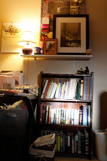 The setting sun shines right on Doyce’s bookshelf in its new home in the downstairs office. This is SOOC.