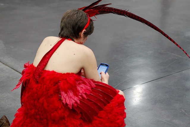 Fawkes the Phoenix checks her mail while watching a Quidditch game. Only at LeakyCon.